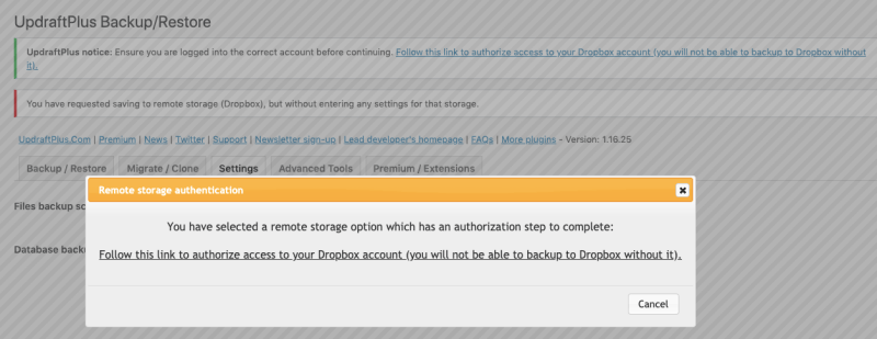 Once you have selected the storage location, a section will be seen with a link to authenticate your account. Also, you need to select which files you want to include in your backups.