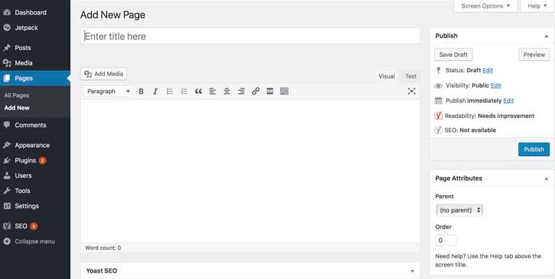 In the top text bar, you will enter the title of the page eg. Home or About Us. In the below text editor section you will add the content of the page. You can even add images, embed videos, and audio using the ‘Add Media’ button.