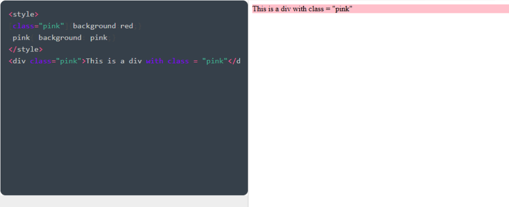 But if we still want to override our style, we can add other selectors to the selectors. For example, in our above example, the class selector can still win if it has higher specificity. By adding a tag like div.pink.