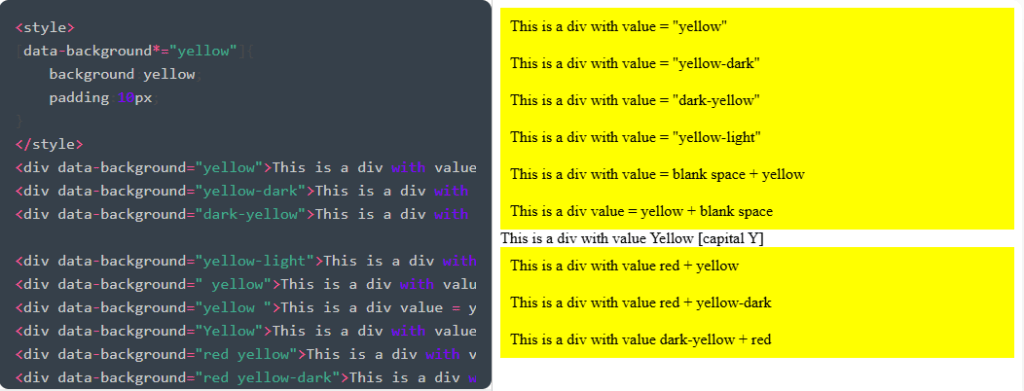[attr*=value] – Selects elements containing at least one occurrence of value within the string. In CSS frameworks, columns can be initialised so all different selectors like .col-1 .col-2 .col-3 can have a common value just with one selector.
